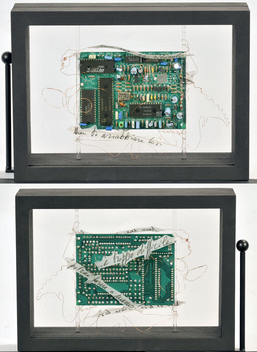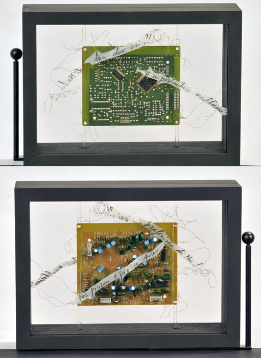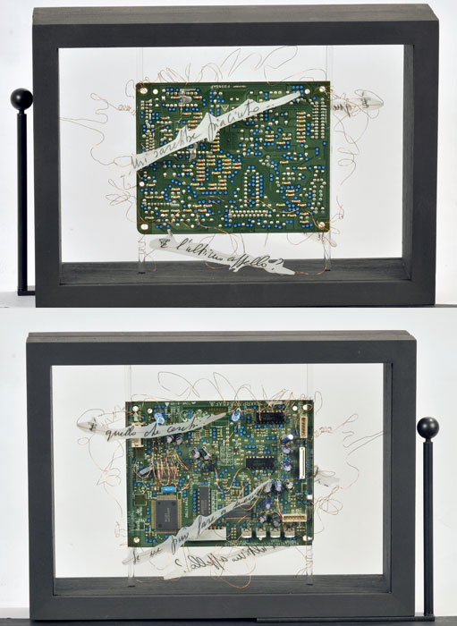 Trenta collage di cm 18x25x3,5 e trenta scatole di cm 18x25x7. Ogni scatola ha due scritte su ciascuna delle facce